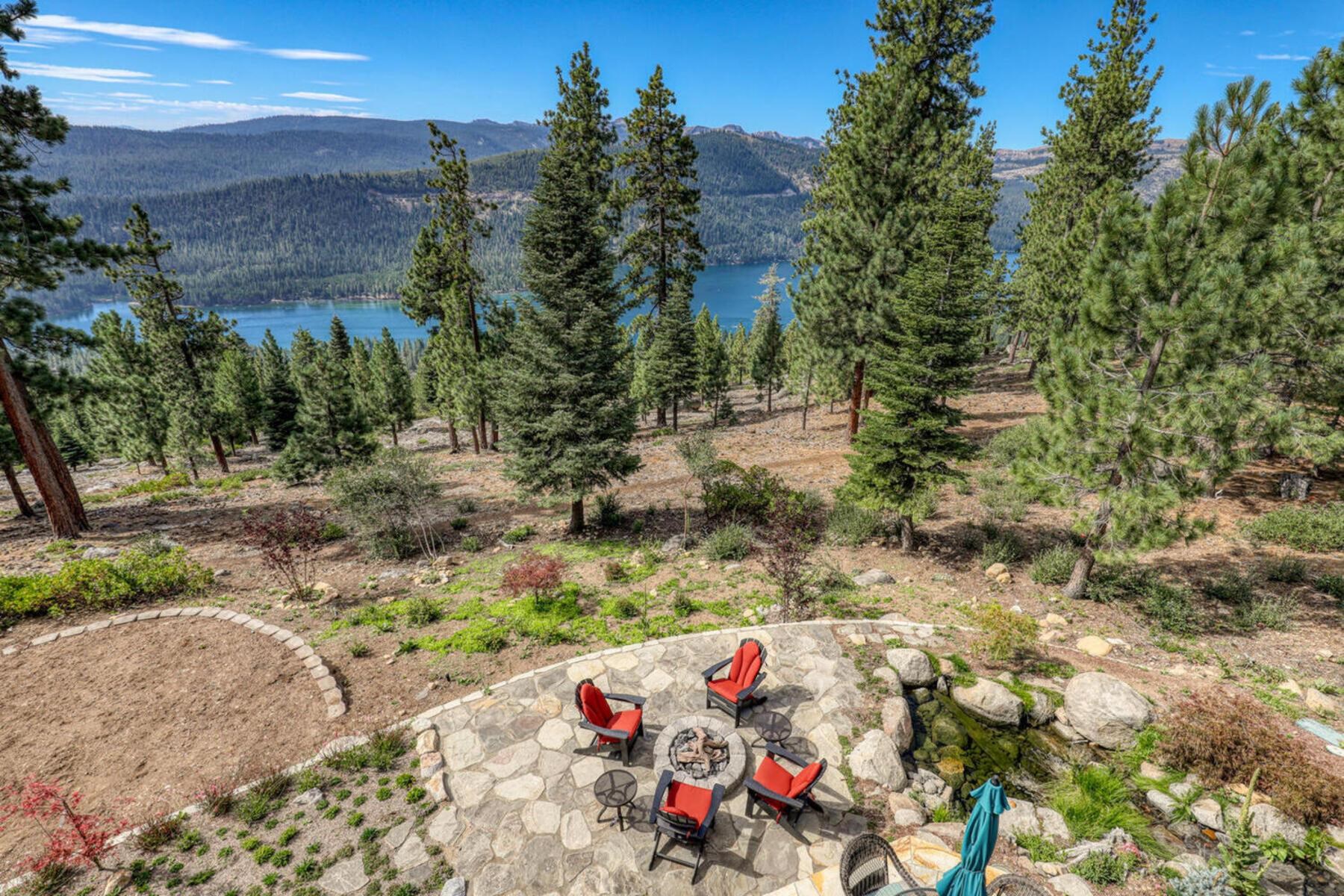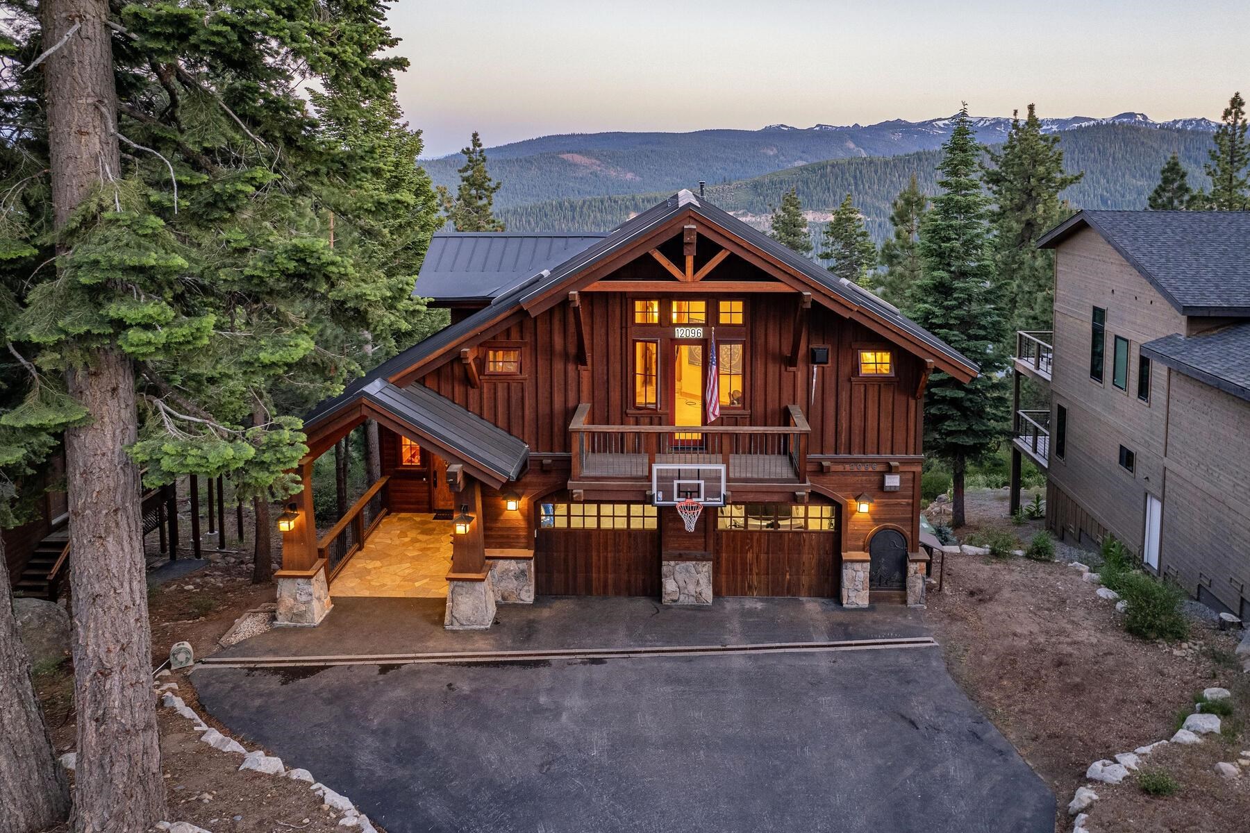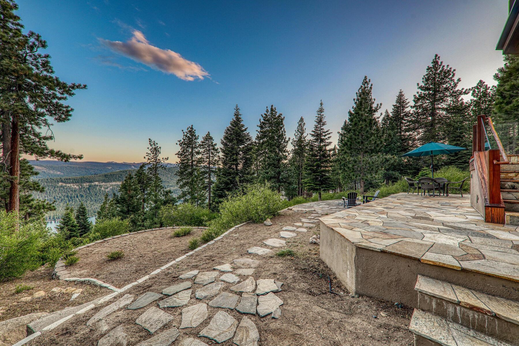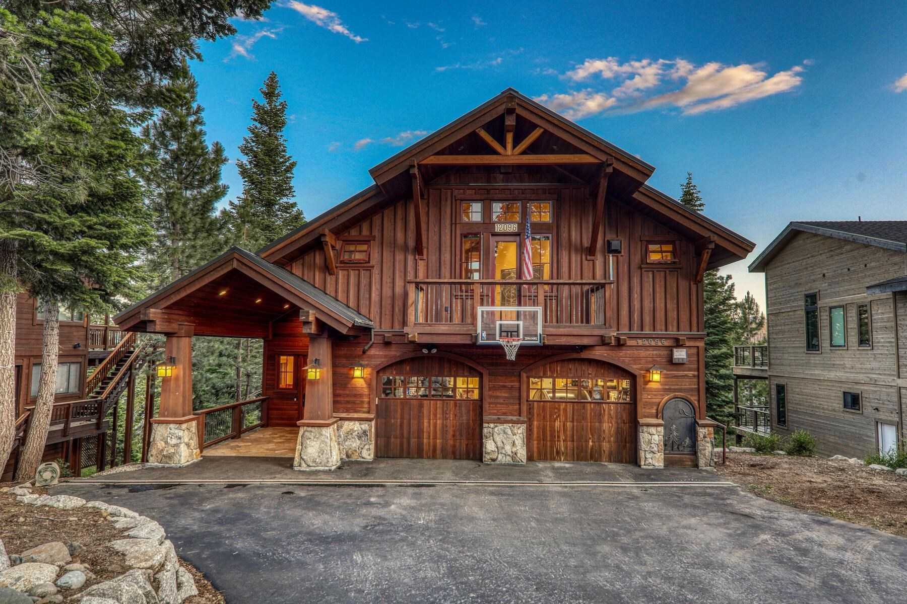 Stunning Custom Mountain Retreat with Unrivaled Panoramic Views! Perched high on one of Tahoe Donner's most coveted ridgelines, 12096 Skislope Way is a truly exceptional luxury mountain home offering awe-inspiring, unobstructed panoramic views of Donner Lake that stretch from the iconic peaks of Northstar Ski Resort to the dramatic contours of Tinker's Knob. From your Great Room, expansive decks, and luxurious primary suite, soak in breathtaking vistas that include the historic railroad line threading through the snow sheds below and the sparkling blue waters of Donner Lake. This custom-crafted residence blends rustic mountain charm with refined finishes and top-tier craftsmanship. Every detail was thoughtfully designed for both elegance and comfort. The heart of the home is the open-concept Great Room, featuring vaulted wood-beam ceilings, a striking stone fireplace, and walls of glass that frame the incredible alpine scenery. The chef's kitchen is equally impressive, anchored by massive slab granite countertops and equipped with professional-grade Viking appliances. Shaker-style cherry cabinetry, Mountain Forge hand-forged iron accents, and rich distressed cherry hardwood floors tie the home's warm, upscale aesthetic together beautifully. Retreat to the primary suite, a private sanctuary with serene views, direct access to the deck and hot tub, and a spa-inspired ensuite bath. Relax in the jetted Jacuzzi tub while listening to the peaceful sounds of a babbling brook water feature just outside your window -- a truly rare and tranquil element in any mountain setting. Outdoor living is elevated with multiple view decks, a lower-level patio, and a private hot tub -- all designed to maximize your enjoyment of the spectacular setting. Whether you're sipping morning coffee at sunrise or unwinding after a day on the slopes, the ever-changing mountain landscape provides an unforgettable backdrop year-round. This home is not just a residence, but an experience -- a rare opportunity to own one of Tahoe Donner's most iconic and visually commanding properties. A perfect blend of luxury, privacy, and natural beauty -- this is mountain living at its finest. Do not miss the chance to make this alpine masterpiece your own.