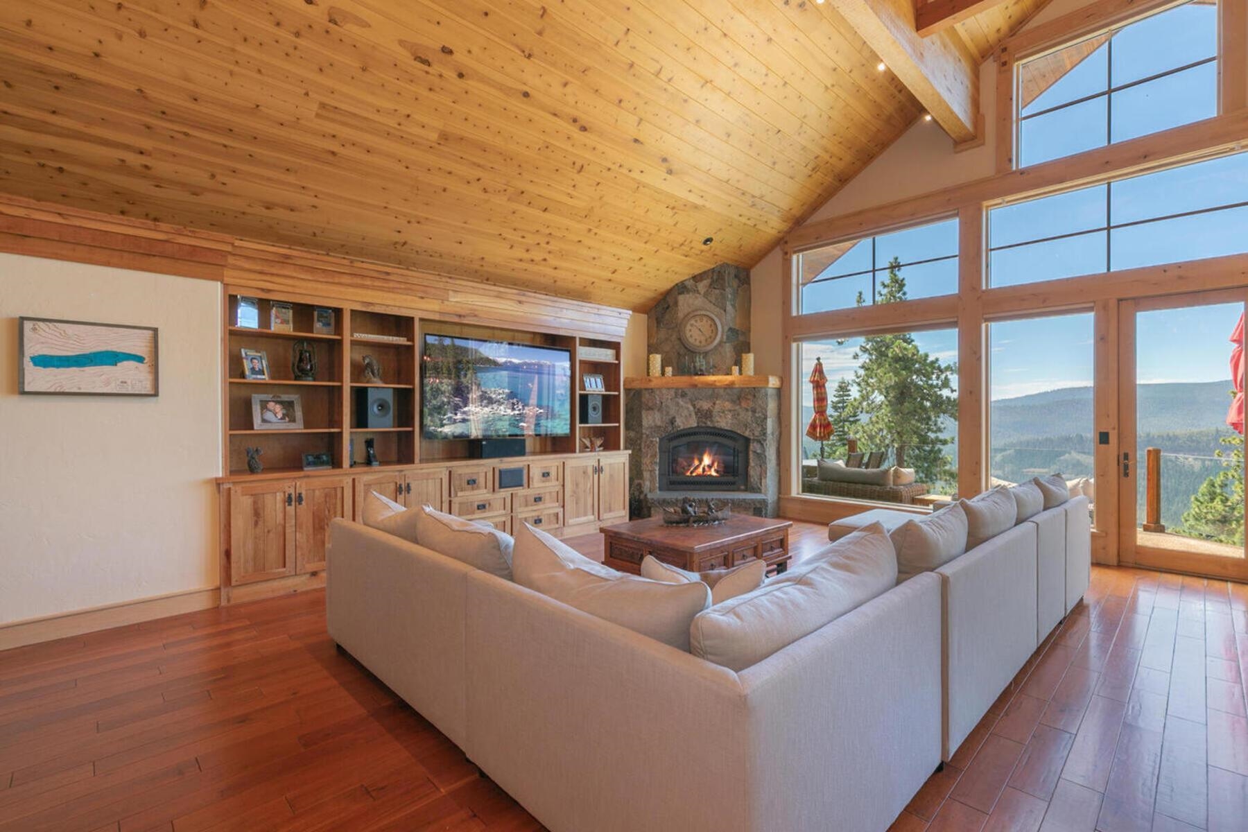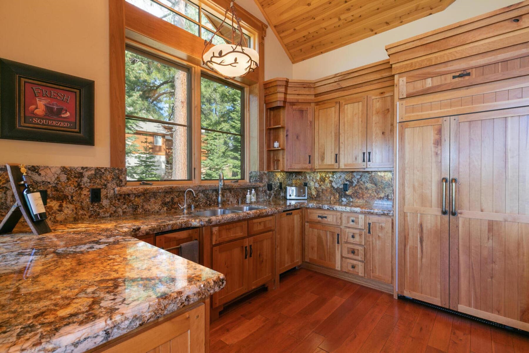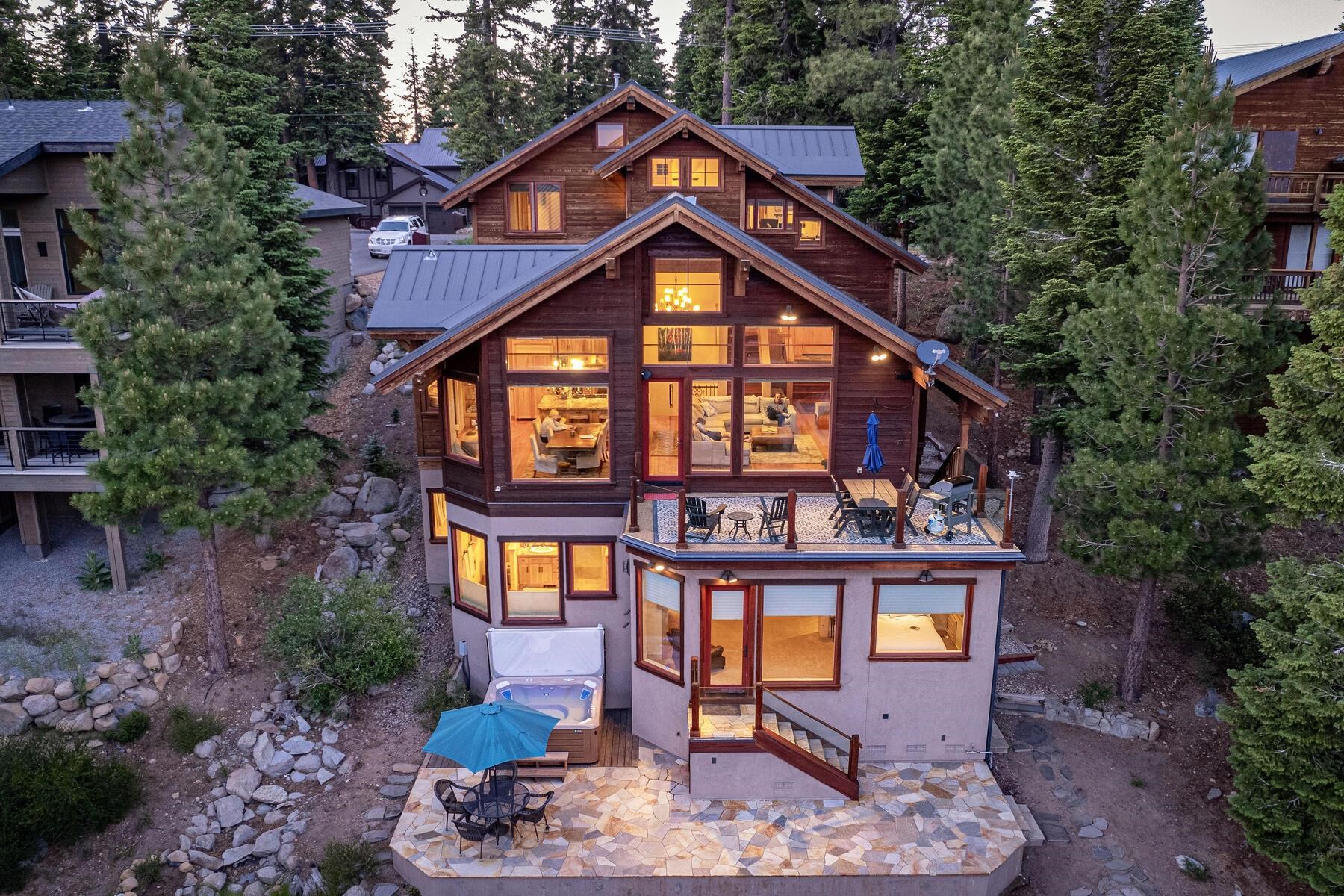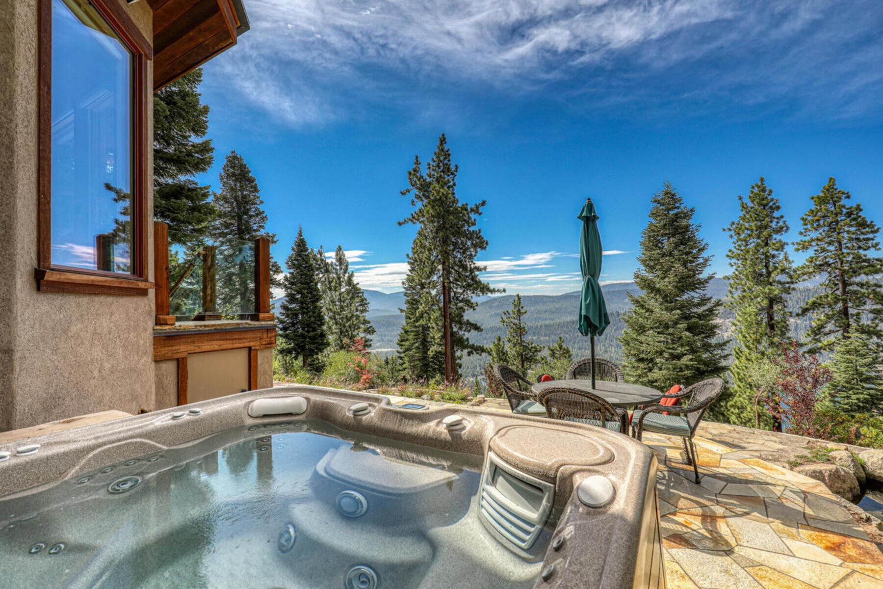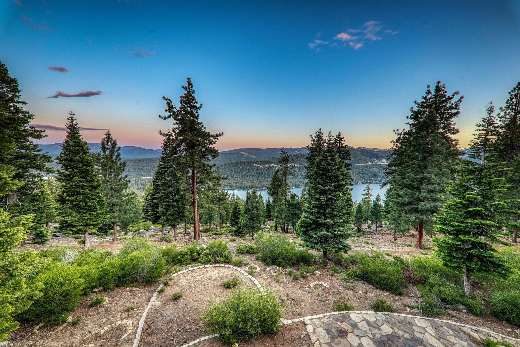 Stunning Custom Mountain Retreat with Unrivaled Panoramic Views! Perched high on one of Tahoe Donner's most coveted ridgelines, 12096 Skislope Way is a truly exceptional luxury mountain home offering awe-inspiring, unobstructed panoramic views of Donner Lake that stretch from the iconic peaks of Northstar Ski Resort to the dramatic contours of Tinker's Knob. From your Great Room, expansive decks, and luxurious primary suite, soak in breathtaking vistas that include the historic railroad line threading through the snow sheds below and the sparkling blue waters of Donner Lake. This custom-crafted residence blends rustic mountain charm with refined finishes and top-tier craftsmanship. Every detail was thoughtfully designed for both elegance and comfort. The heart of the home is the open-concept Great Room, featuring vaulted wood-beam ceilings, a striking stone fireplace, and walls of glass that frame the incredible alpine scenery. The chef's kitchen is equally impressive, anchored by massive slab granite countertops and equipped with professional-grade Viking appliances. Shaker-style cherry cabinetry, Mountain Forge hand-forged iron accents, and rich distressed cherry hardwood floors tie the home's warm, upscale aesthetic together beautifully. Retreat to the primary suite, a private sanctuary with serene views, direct access to the deck and hot tub, and a spa-inspired ensuite bath. Relax in the jetted Jacuzzi tub while listening to the peaceful sounds of a babbling brook water feature just outside your window -- a truly rare and tranquil element in any mountain setting. Outdoor living is elevated with multiple view decks, a lower-level patio, and a private hot tub -- all designed to maximize your enjoyment of the spectacular setting. Whether you're sipping morning coffee at sunrise or unwinding after a day on the slopes, the ever-changing mountain landscape provides an unforgettable backdrop year-round. This home is not just a residence, but an experience -- a rare opportunity to own one of Tahoe Donner's most iconic and visually commanding properties. A perfect blend of luxury, privacy, and natural beauty -- this is mountain living at its finest. Do not miss the chance to make this alpine masterpiece your own.