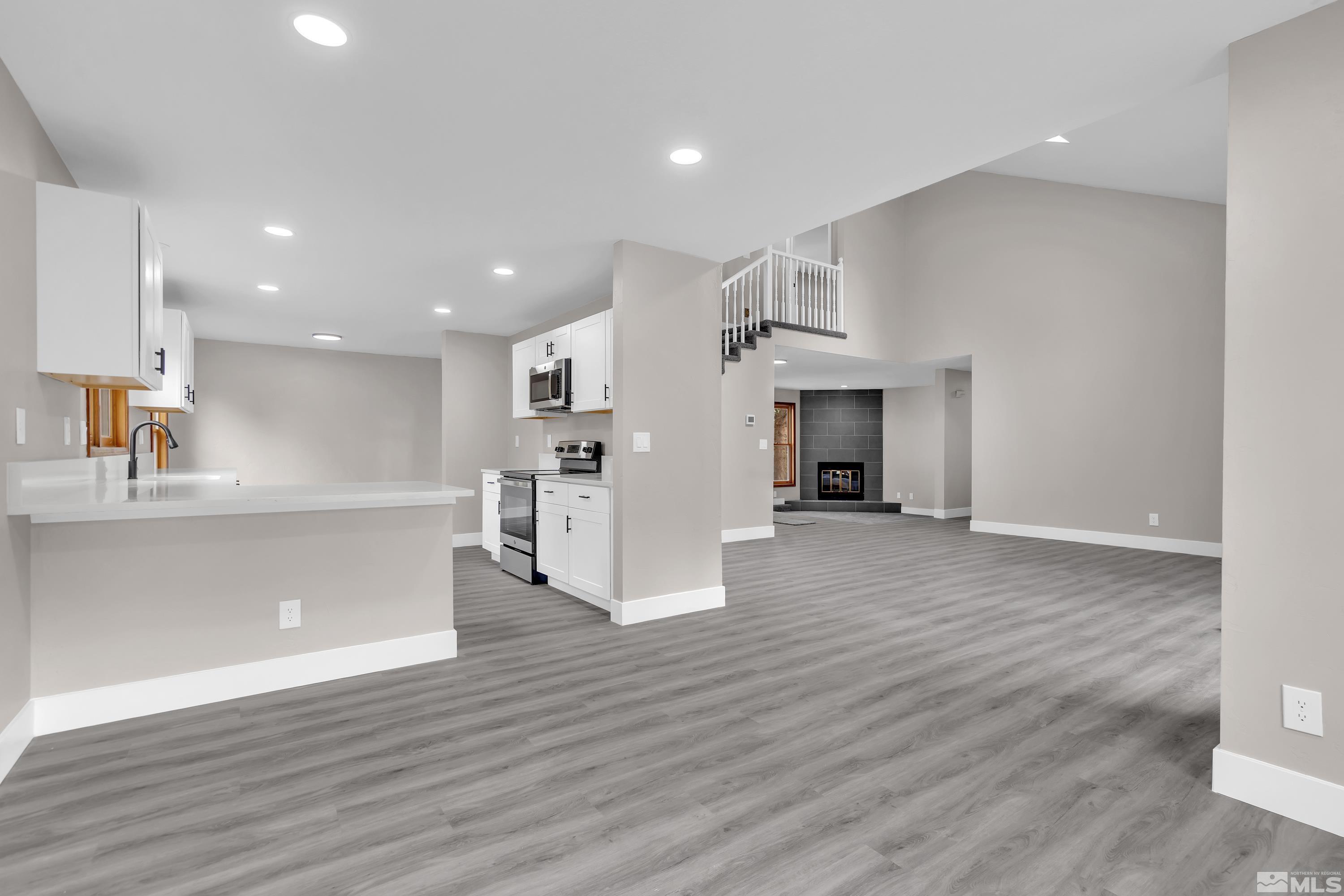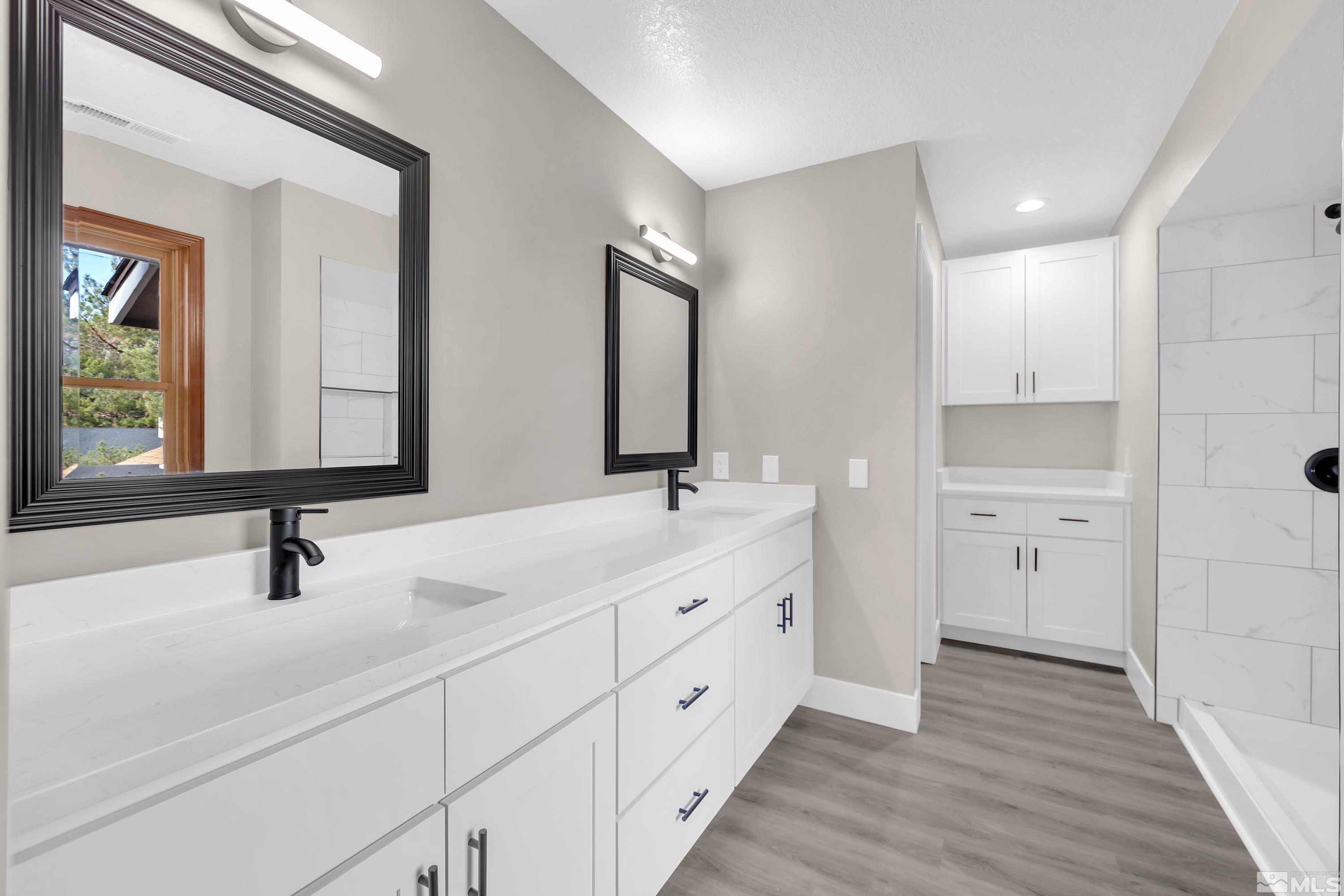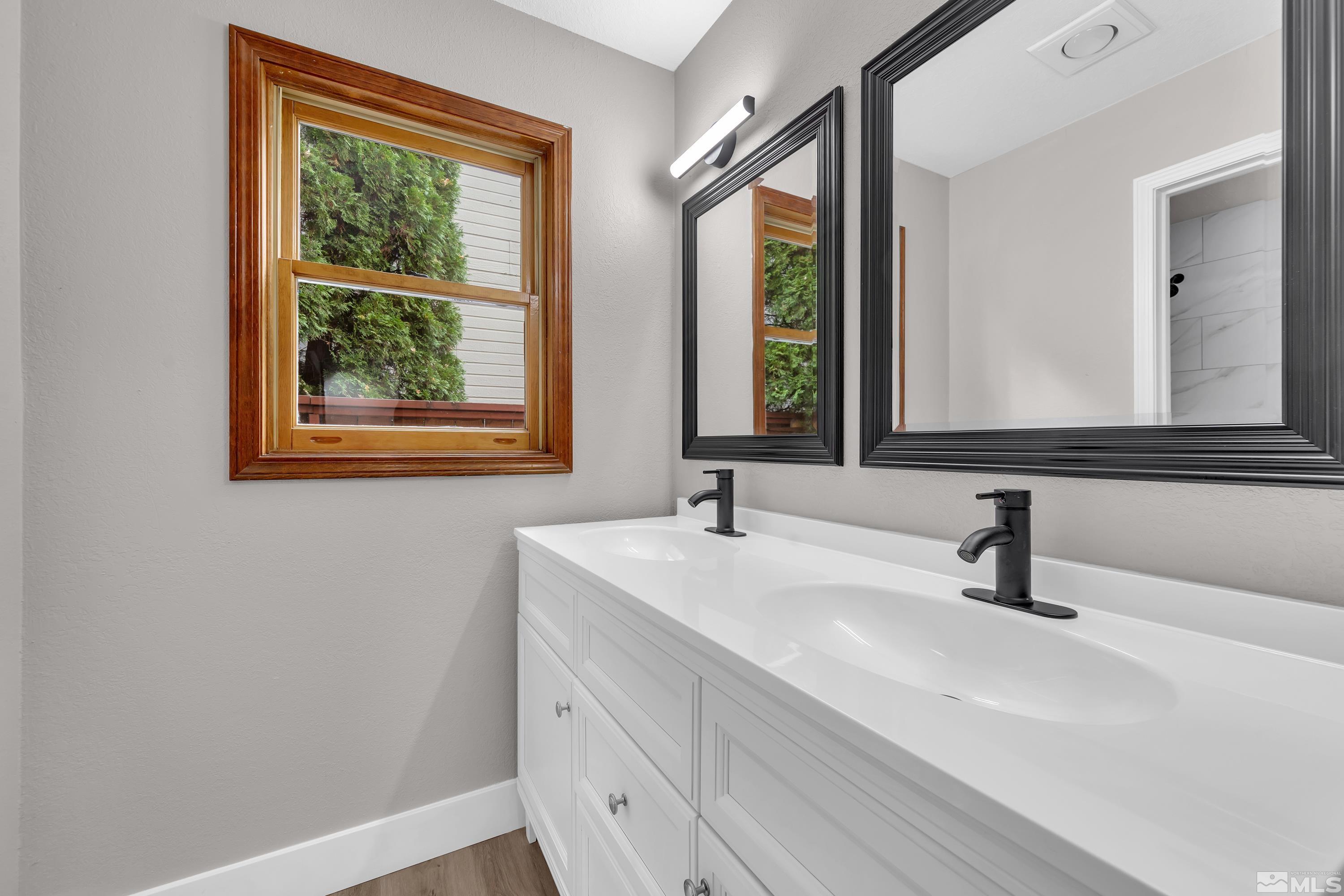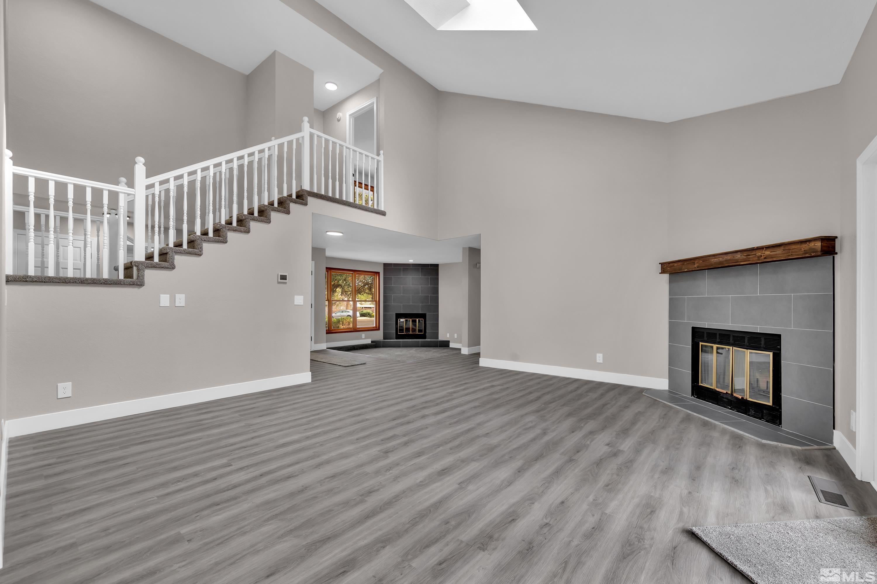 Beautifully fully remodeled home with so many beautiful finishes. Driving up the driveway you're greeted with fresh exterior paint and mature landscaping! Walking in the front door is new luxury vinyl plank and high vaulted ceiling. The kitchen has new cabinets and beautiful white quartz with black shaded streaks. The kitchen has a nice sized breakfast nook and on the opposite side is a large dining room that opens to the family room. The new fireplace surround tile and mantle are a great way to unwind, after a long day or rest in the separate living room that also has a fireplace. There are three large secondary bathrooms downstairs with a full ball and half bath. Walking up stairs with new high end carpet to the master retreat! The bedroom is oversized with a huge walk in closet that is separated beautifully for two people. The huge bathroom has double vanities and a separate linen cabinets and has a large walk-in shower with soap niche.